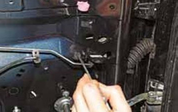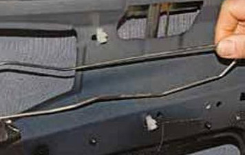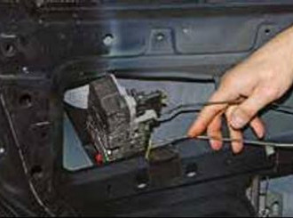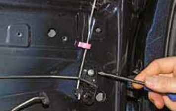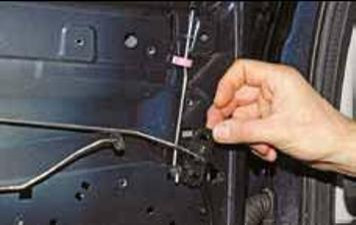 Этап №2: отсоединяем тягу блокировки двери, выводим ее из полости двери.